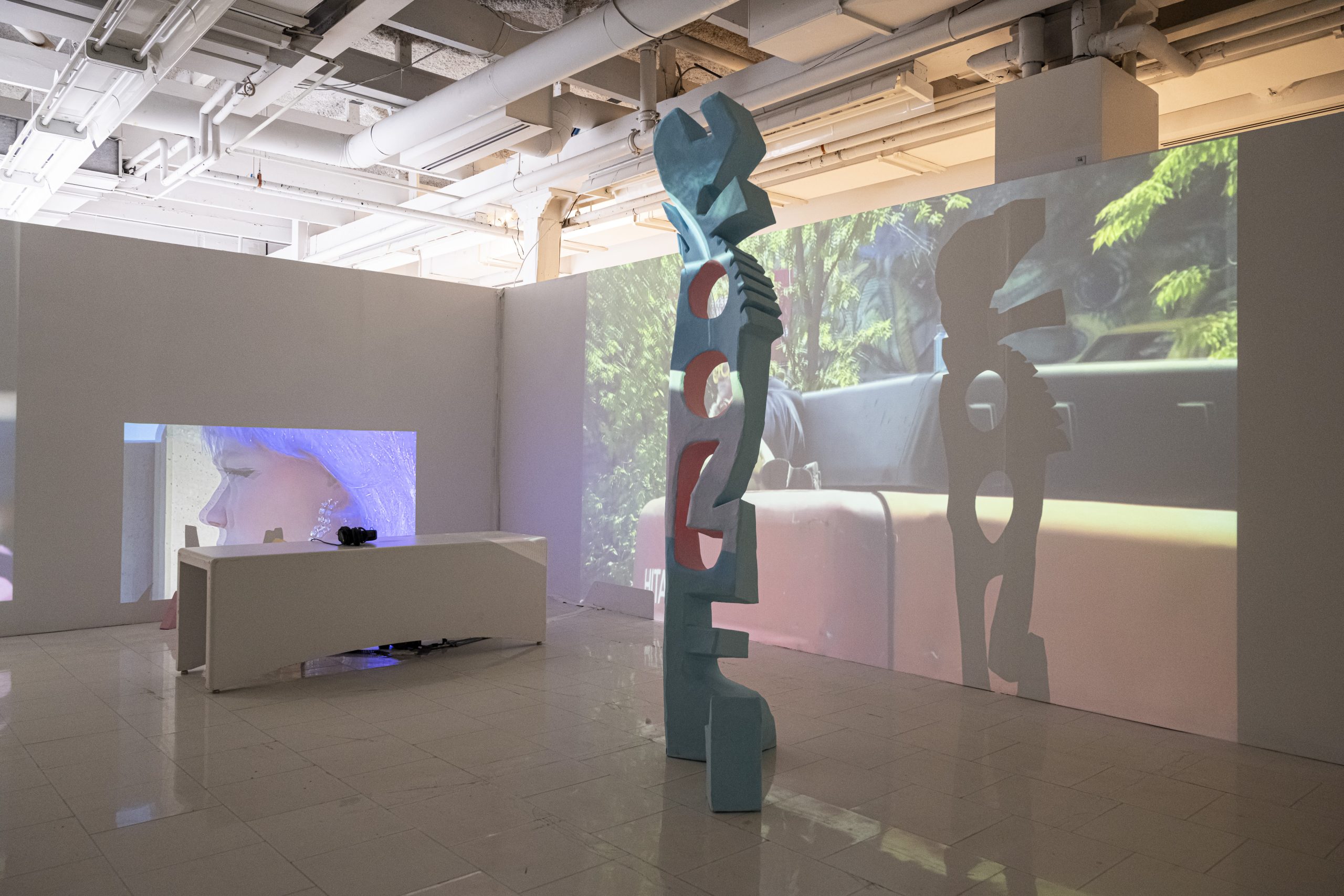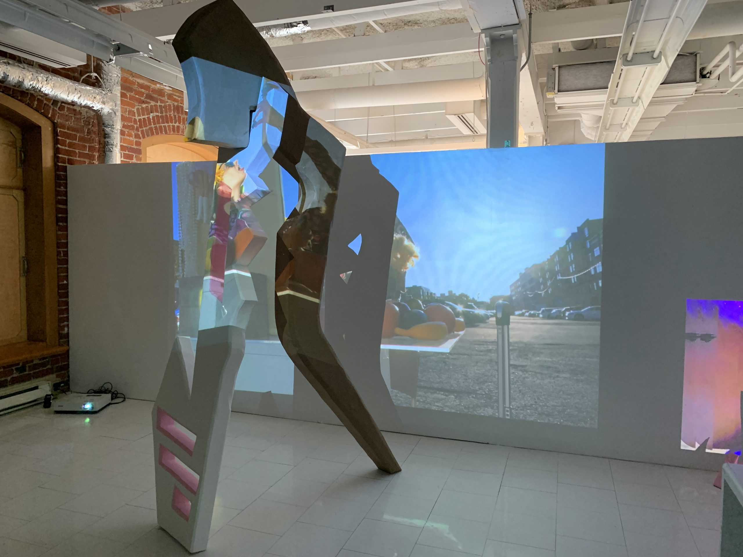 Installation sculpture et projections, carton, papier et colle à papier, vidéos