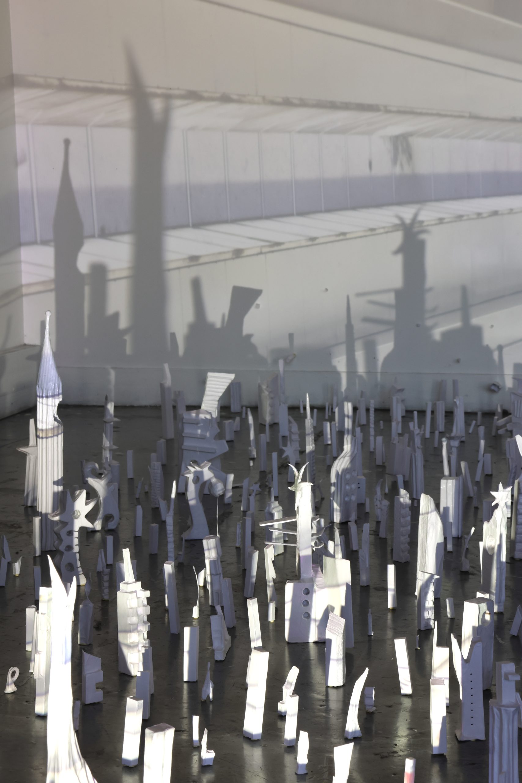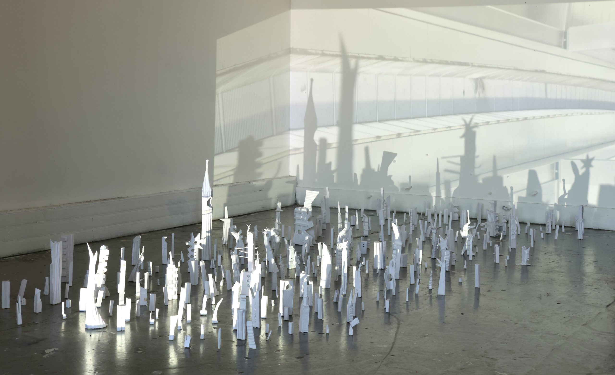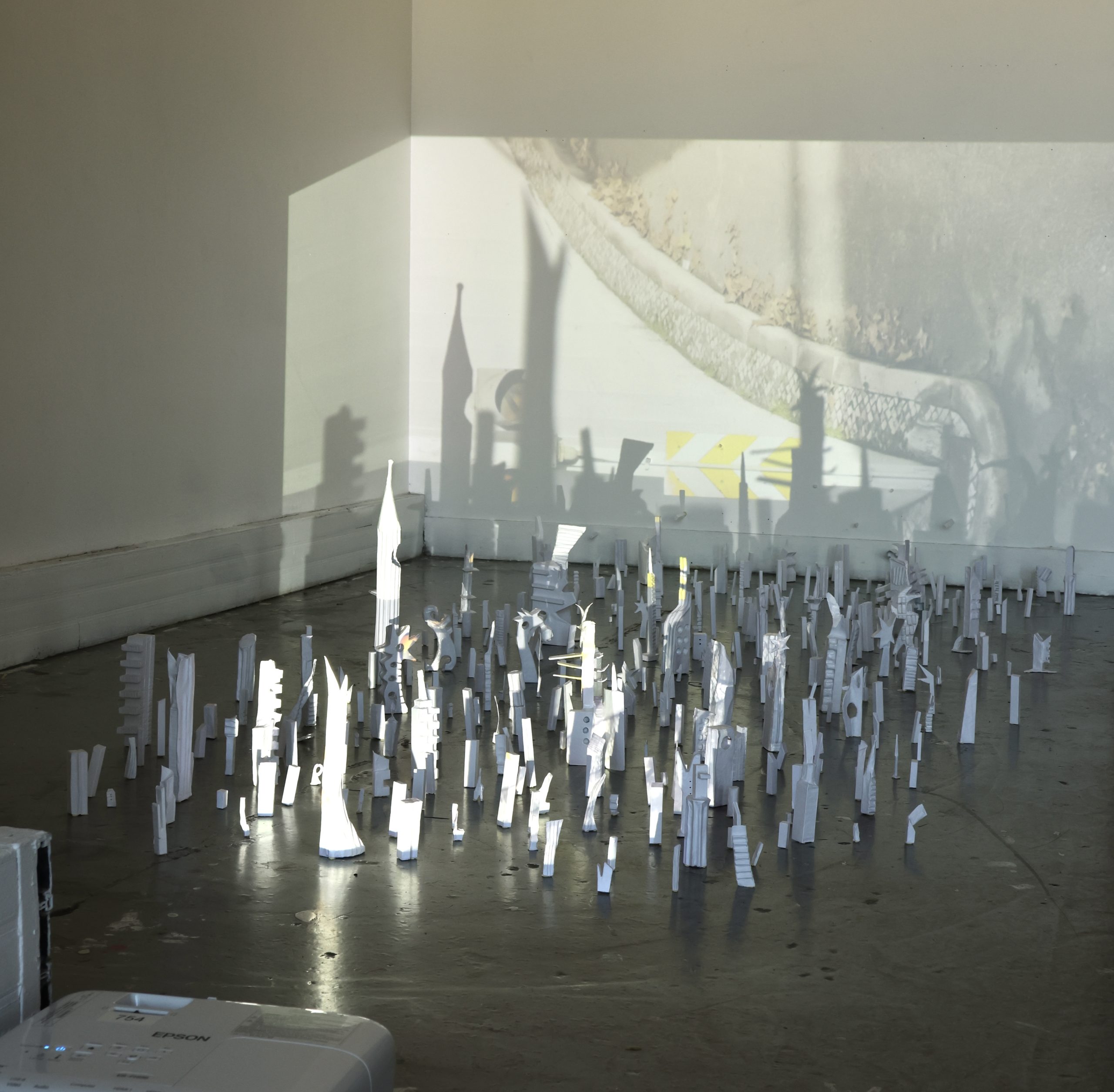 J’ai vu la Ville-Gazon sous le Périphérique est une installation rassemblant sculptures et vidéos. Questionnant la quantité de végétation dans l’urbanité et de son impact sur la sensation d’inclusivité dans les villes, ce projet, par la mise en espace de petits édifices, a pour viser de créer une sensation de « gazon » et d’herbes urbaines envahissant le sol. Des séquences vidéo captées sous le Périphérique de Paris sont projetées sur les petits édifices. Les ombres ainsi créées dialoguent avec la dualité brutalité/beauté furtive existant dans des lieux urbains oubliés.