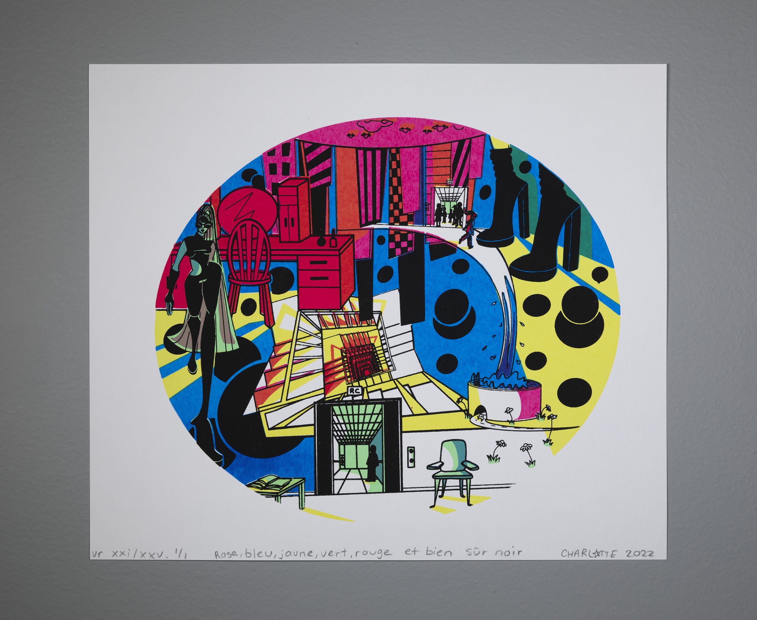 Rose, bleu, jaune, vert, rouge et bien sûr noir Œuvre : Sérigraphie, vr. XXI/XXV, 1/1, 25 x 21 cm Crédits photos : Charlotte Larouche Date : 2022 Partagez :