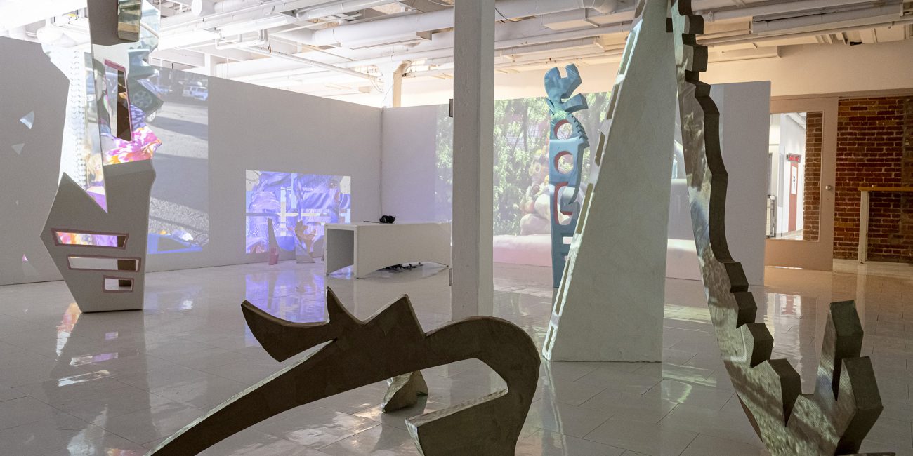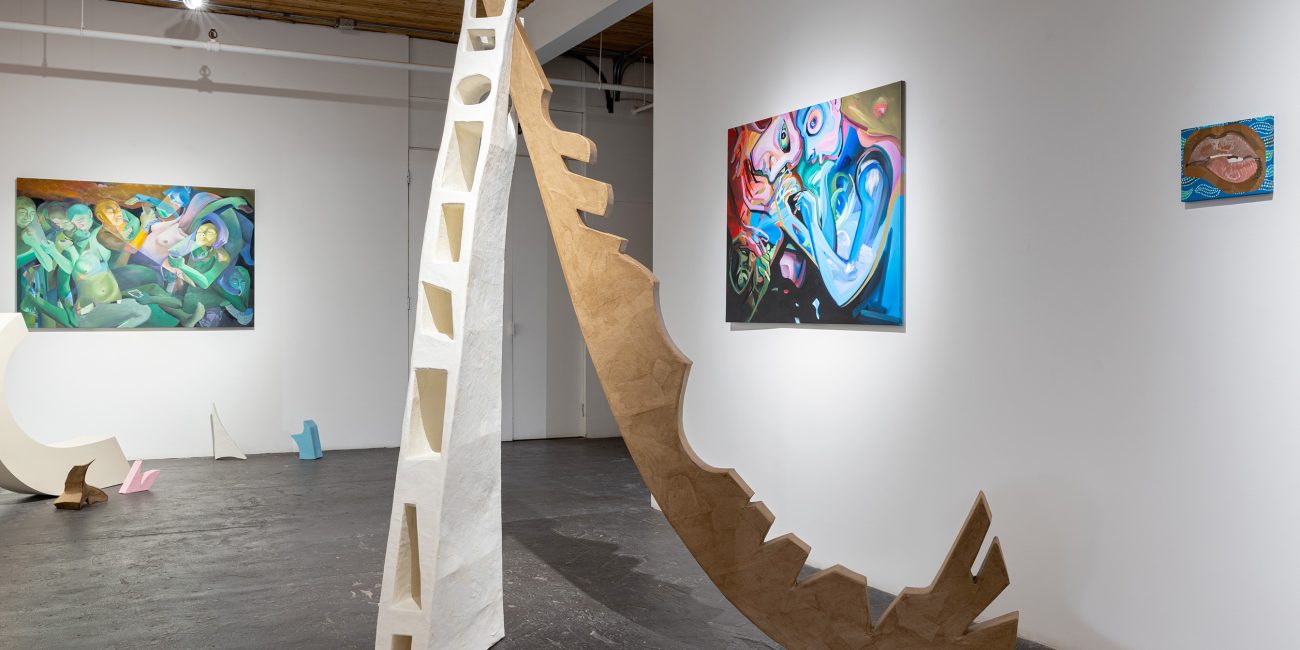 Œuvres présentées : Photo 1 : Être femme sous la ville, la lueur d’une existence rebelle 1 et 2, 236 x 116 x 57 cm, 2024. Photo 2 : Sans titre, sculpture, bois, mdf, 105 x 115 x 21 cm, 2020. Sans titre 5, sculpture, carton, papier et colle à p